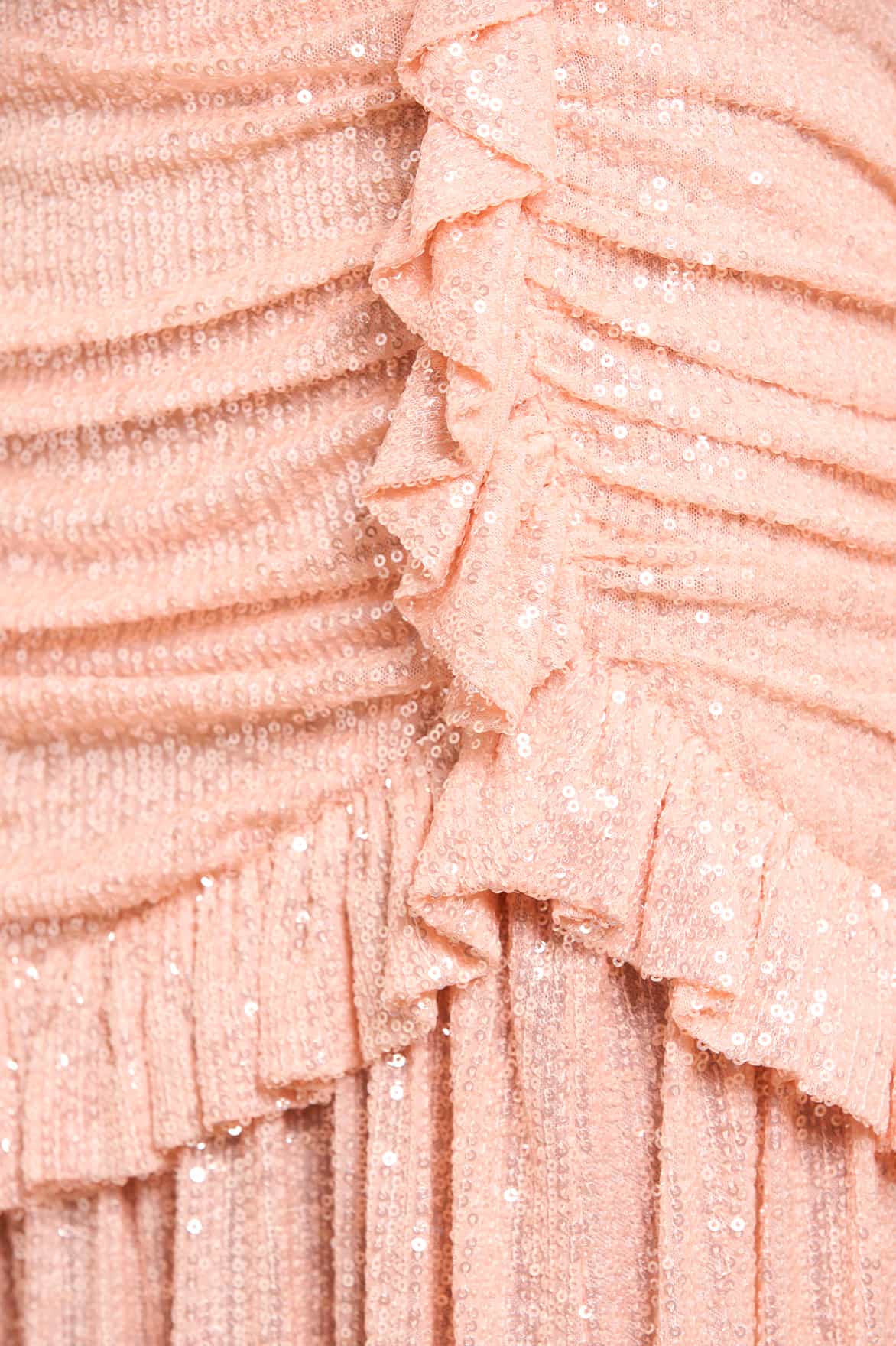 The Alessia One Shoulder Gown in Apricot. Designed with flattering gathered ruching, signature Needle & Thread frills, and a romantic one-shoulder design. Crafted with a blouson sleeve with a ruffle cuff adds elegance, while the dropped waist seam is enhanced with more ruffles. Developed from a delicate stretch mesh with tiny sequins, it offers a shimmering, luxurious finish. A timeless addition to your wardrobe, this gown combines effortless style and everyday luxury.