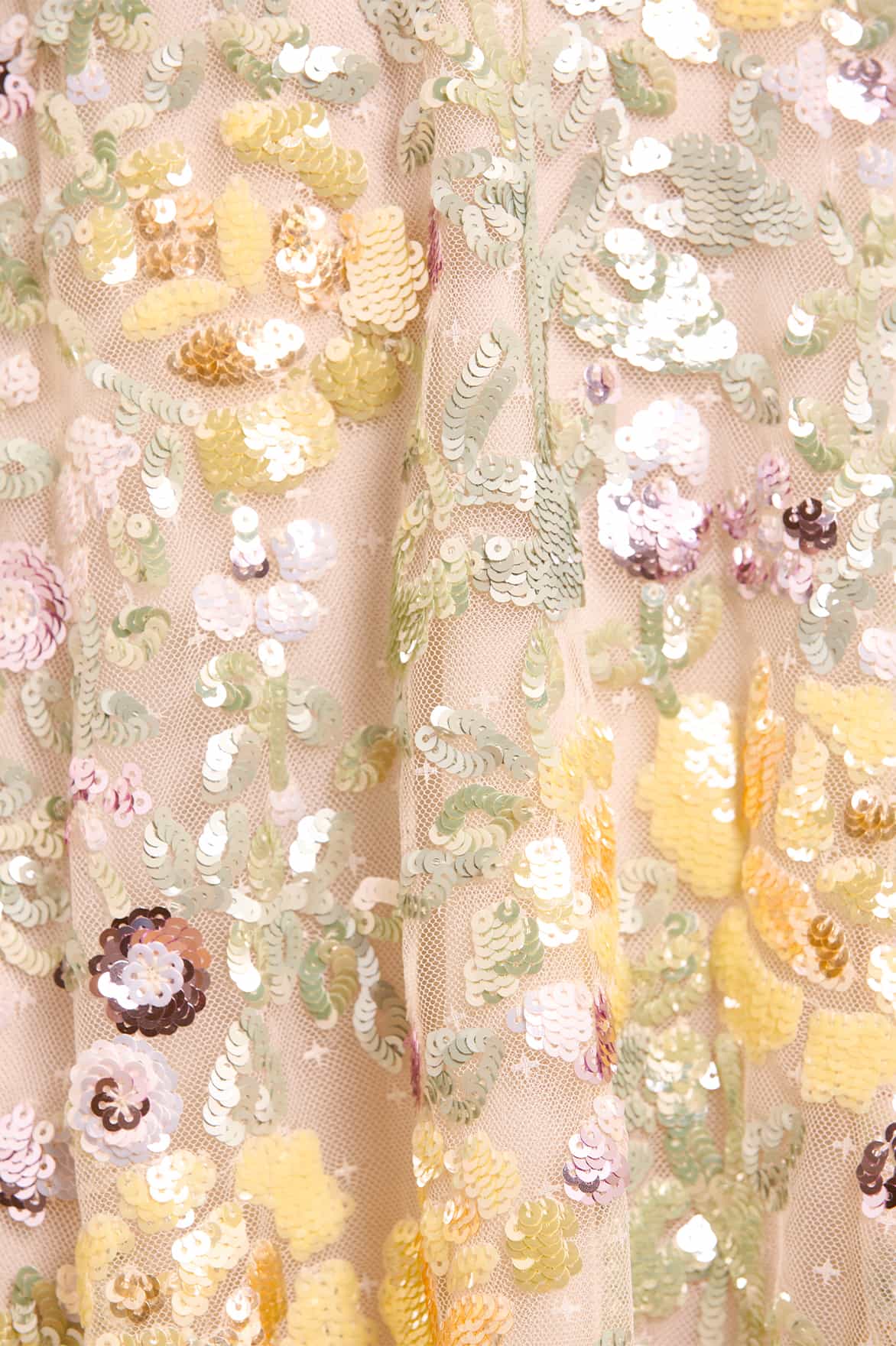 The Elina Rose Short Sleeve Mini Dress in Cream. This mini dress features luxurious 3D sequin floral embellishments with a high-shine gloss finish. Crafted with delicate lace-edged fluted sleeves and frothy tulle frills at the neckline and armholes add a romantic touch. The skirt is crafted from layers of soft tulle, embodying signature Needle & Thread styling. A dress that will make you feel effortlessly enchanting.