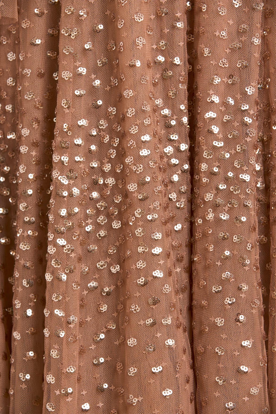 The Scatter Dot Round Neck Ankle Gown in Mocha. This embellished gown is decorated with exquisite shimmering dot motifs, undulating in wave formations for a captivating glittering effect. The round neck bodice is trimmed with signature Needle & Thread tulle trims at the neckline and shoulders for romantic detailing. The elegant long fluted sleeves are adorned with tiny sparkling sequin motifs, and the skirt is made up of generous layers of net and tulle with a sweeping hemline. This magical piece is perfect for an upcoming special occasion and beyond.